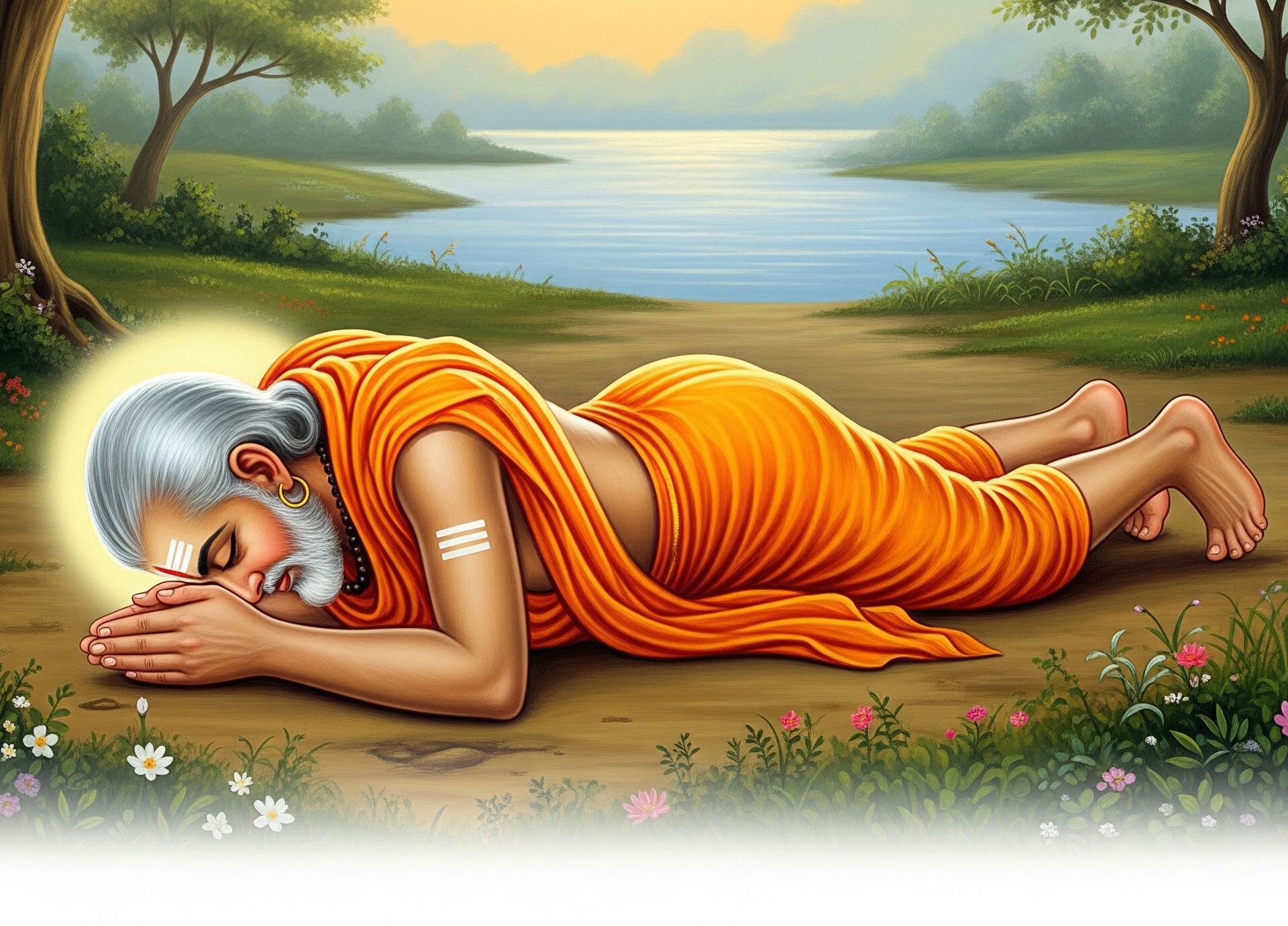 Shashtanga Namaskaram — A Complete Surrender to the Divine Sloka of Reference urasA SirasA dRuShTyA manasA vachasA tathA | padByAM karAByAM Karnaabyam praNamOSShTAnga uchyatE This verse outlines the eight limbs engaged in full-body prostration (Shashtanga Namaskaram) before the divine: • urasā (chest) • śirasā (head) • dṛṣṭyā (sight or eyes) • manasā (mind) • vacasā (speech) • padbhyāṁ (feet/legs) • karābhyāṁ (hands) • karṇābhyāṁ (ears) Note: This sloka is not meant to be chanted during the act of Namaskaram, but serves as a guide for its ideal form and intention. 🧘♂️ Essence of the Practice Shashtanga Namaskaram is more than a posture—it is a symbolic act of complete surrender and devotion. The devotee places eight body parts in contact with the ground, embodying humility and seeking divine grace and forgiveness. This namaskaram is traditionally prescribed for men. Women, due to their distinct energy flow (shakti), are advised to perform Panchanga Namaskaram (kneeling prostration), offering the same spiritual merit with appropriate reverence. Preparatory Guidelines • Ensure adequate space and the appropriateness of the location. For instance, Shashtanga Namaskaram is not allowed inside certain temple sanctums. • Maintain awareness and respect for local customs and temple rules. Step-by-Step Procedure 1. Initial Posture Stand with palms joined in front of the chest, fingers closed. Then raise both arms above the head, allowing shoulders to touch the ears. This symbolizes a straight, unwavering "danda" (stick). 2. Darshan and Descent Keep eyes open to absorb the divine form (Bhagavat Murti). Store this image in your heart. Bend forward, place hands on the ground, step back one leg at a time, and lie flat. 3. Full Prostration Extend hands above the head, shoulders touching ears. With eyes closed, meditate upon the divine image. Chant a mantra, such as “Jai Sri Ram,” “Har Har Mahadev,” or “Jai Mata Di.” 4. Symbolism of Touch Ensure the front of thighs, knees, chest, nose, hands, and feet touch the ground—symbolizing complete surrender. 5. Ears (Karṇābhyām) o Bring hands near chest o Tilt head right to touch right ear to ground o Tilt head left to touch left ear to ground o Repeat 3 times 6. Shoulders o Interlock hands behind the back o Tilt body right and touch right shoulder to ground o Tilt body left and touch left shoulder to ground o Repeat 3 times 7. Return to Standing Posture Lift head to once again receive darshan. Retrace your steps: hands above head, then back to chest in namaskar mudra. Final Reflections In this sacred act, one symbolically casts away ego and petitions for inner purification. Each limb offered to the earth is an offering to the divine—a gesture of complete humility and heartfelt devotion. Sarvam Shri Krishnarpanamastu 🙏 Sri Gurubhyo Namaha